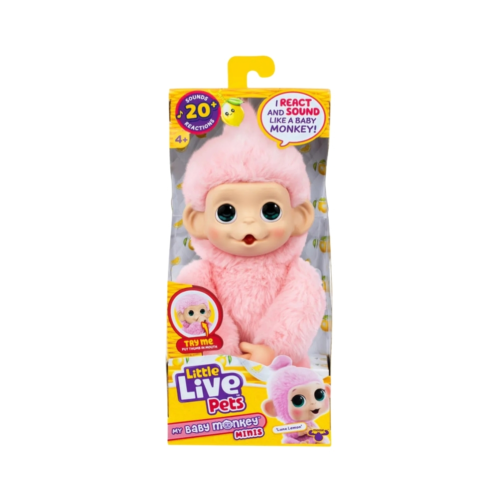 - Meet Little Live Pets My Baby Monkey Minis – Luna Lemon, an adorable interactive companion full of personality! This cute baby monkey responds to your touch with lifelike movements, making playtime feel fun and engaging. Luna Lemon can grip, grab, hang, and hug onto objects, just like a real baby monkey, and even suck her thumb for extra charm. Designed for nurturing play, kids can feed and care for Luna Lemon while building a special bond through interactive reactions. Perfect for imaginative role-play and animal lovers, this lovable mini monkey brings joy, fun, and companionship to every playtime.