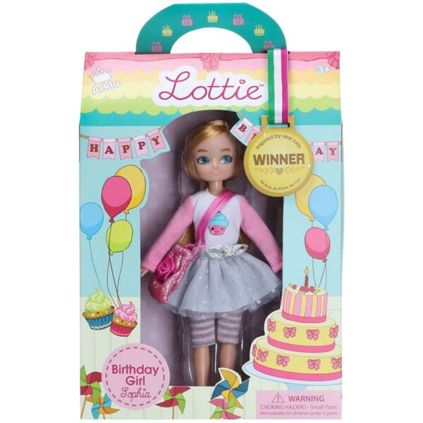 - The Birthday Girl Lottie doll is all about celebrating birthdays with friends and family. With a cute outfit including a T-shirt with a cupcake print, a silver tutu, and sparkly pink accessories, she’s ready to party. After the celebration, Lottie will help make thank-you cards for all the guests. The doll comes with three mini cards, including an invitation, a birthday card, and a thank-you card. The doll is presented in a brightly colored box with a handle for easy transport and makes a great addition to any doll collection.