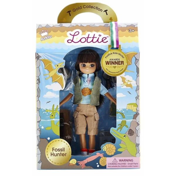 Lottie Fossil Hunter is a doll set that features Lottie, a young paleontologist who is passionate about discovering the mysteries of the prehistoric world. She comes with an olive-colored gilet puffa vest, turquoise blue polo shirt with an ammonite shell design print, cargo shorts, orange and white stripe socks, sturdy boots, baseball cap, a rucksack, fossil hunting tools (magnifying glass, trowel, and geology hammer), four ammonite fossils, special collector cards about the British female fossil hunter Mary Anning, notable women in paleontology additional sheet.