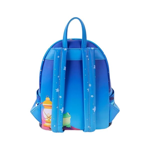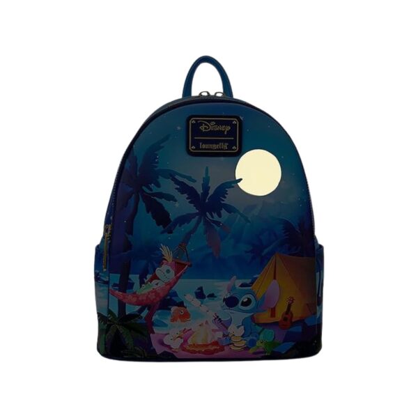- Get ready for a cozy night under the stars with the Loungefly Disney Lilo & Stitch Camping Cuties Mini Backpack! This adorable mini backpack captures the magic of a tropical camping adventure with Stitch and friends. On the front zipper pocket, Stitch roasts marshmallows at a campsite, surrounded by Scrump, Pudge, a frog, ducklings, and a turtle. The glowing full moon and stars above the palm trees add a special touch—turn down the lights to see them glow in the dark! The beach scene continues on the side pockets, where turtles and ducklings wander along the sand. On the back, a frog sits near a lantern beneath starry shoulder straps. This spacious and fun mini backpack is perfect for carrying your essentials while hanging out with friends.