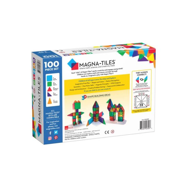 - Unleash creativity with Magna Tiles Clear Colors, a captivating set of translucent magnetic tiles! With 100 pieces including squares and triangles, kids can create limitless designs. The stained glass appearance adds visual delight to play, while nurturing math, science, and spatial skills. Made from safe, durable materials, these tiles are STEM-approved for worry-free play.