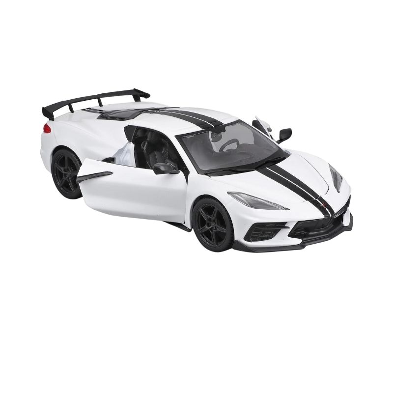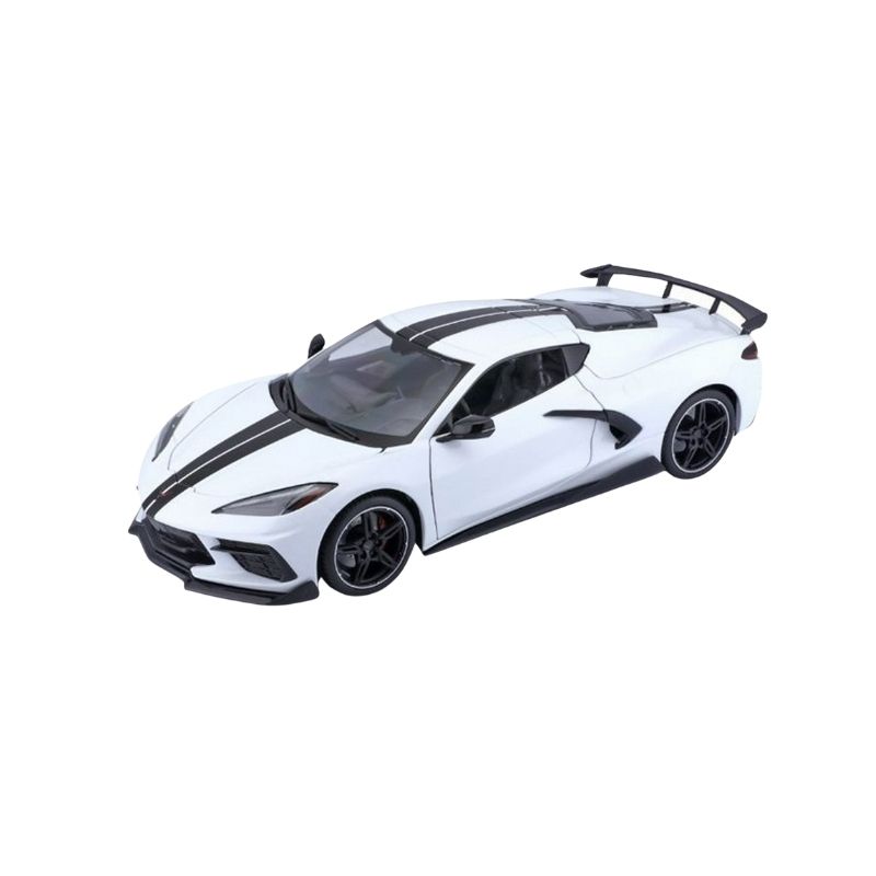 - The Maisto 1:24 scale 2020 Chevrolet Corvette Stingray Coupe in white showcases the sleek, modern design of the iconic C8 Corvette. Featuring a high-quality die-cast metal body, realistic proportions, and finely detailed exterior styling, this model perfectly reflects the bold mid-engine layout and performance spirit of the real Corvette Stingray. A must-have for collectors and Corvette enthusiasts, it makes a striking display piece in any collection.