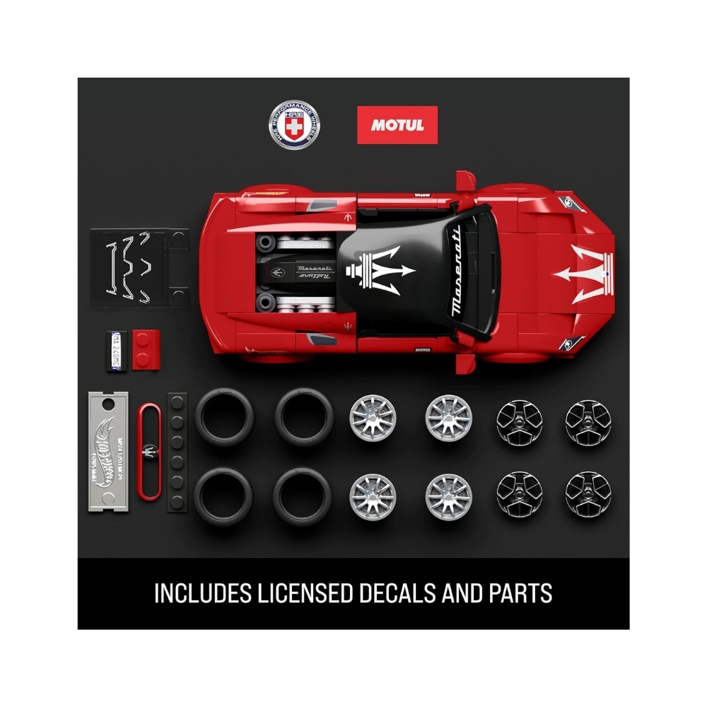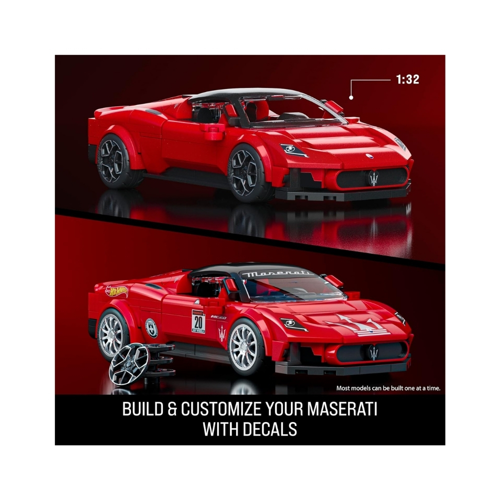 - Build the Maserati MC20 in 1:32 scale with this Mattel Brick Shop set, featuring authentic details like opening double doors and a visible engine. Customize with stickers and wheel trims, and enjoy an exclusive 1:64 scale metal car and license plate. Compatible with other building brands, this set is perfect for kids, hobbyists, and collectors.
