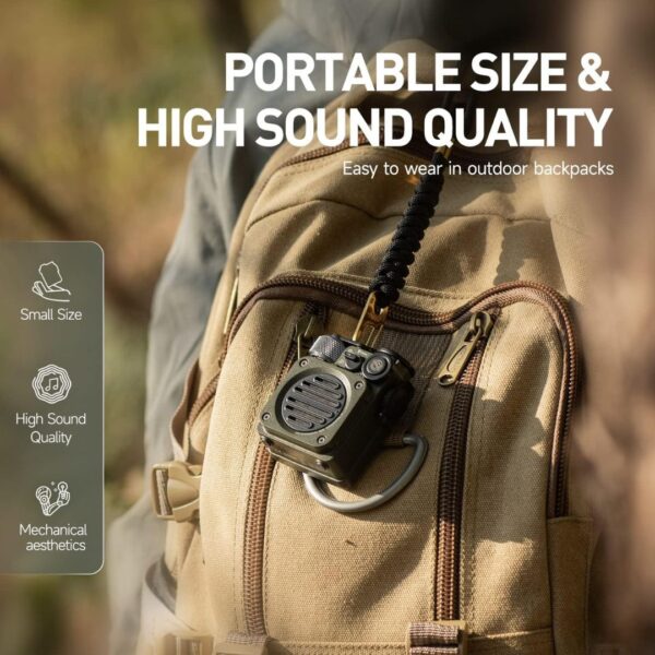- The speaker features an integrated carabiner clip, allowing you to conveniently attach it to your backpack, belt loop, or any other gear for easy transport and accessibility.
