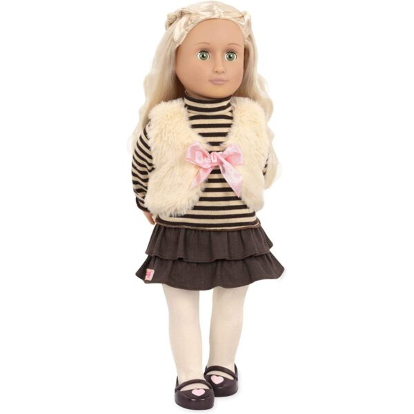 - Includes: 1 non-poseable 18-inch doll, 1 vest, 1 striped turtleneck, 1 skirt, 1 pair of tights, 1 pair of undies, and 1 pair of shoes.