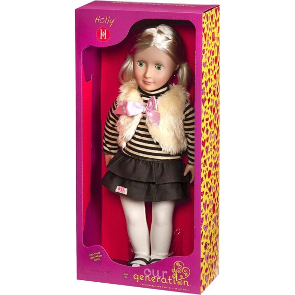 - Get ready for incredible adventures, lots of memories, and an endless amount of fun with Holly! She has blonde hair, green eyes that open & close, and sports a trendy outfit that includes tights, a frilly skirt, and a striped turtleneck. Holly is ready to embark on a lifelong journey with your little one – let the friendship, fun, and games begin!