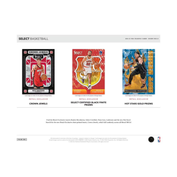 The Select Basketball Hobby Mega Box brings back Panini’s popular Opti-Chrome technology, packed with stunning parallels, autographs, memorabilia, and inserts for every type of collector. Featuring four tiers of base cards — Concourse, Premier Level, Courtside, and the retail-exclusive Mezzanine — this release offers depth and variety. Each box averages 10 exclusive Base Prizms, 6 additional Base Prizms, and 2 Inserts/Insert Parallels, making it a must-have for basketball card enthusiasts. Look out for retail-exclusive inserts like Rookie Revolution, Select Certified, Neon Icon, Lodestars, Hot Stars, and the short-printed Crown Jewels. Collectors can also chase randomly inserted retail-exclusive autographs, including the Hobby Mega-exclusive Green Stars (#/49).