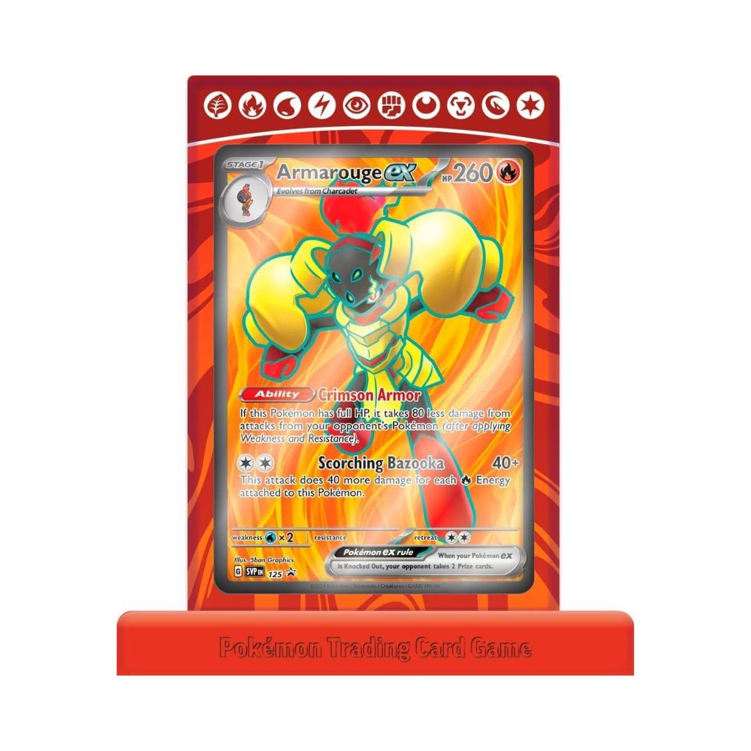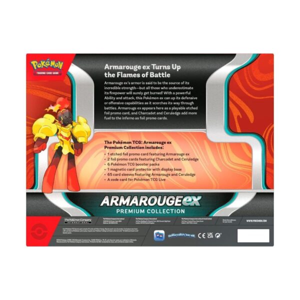 • Unleash fiery power with the Pokémon TCG: Armarouge ex Premium Collection! This premium set highlights Armarouge ex alongside Charcadet and Ceruledge in exclusive promo cards. Packed with booster packs, card sleeves, and a magnetic display case, this collection is perfect for players, collectors, and Pokémon fans who want to showcase and protect their favorite cards.