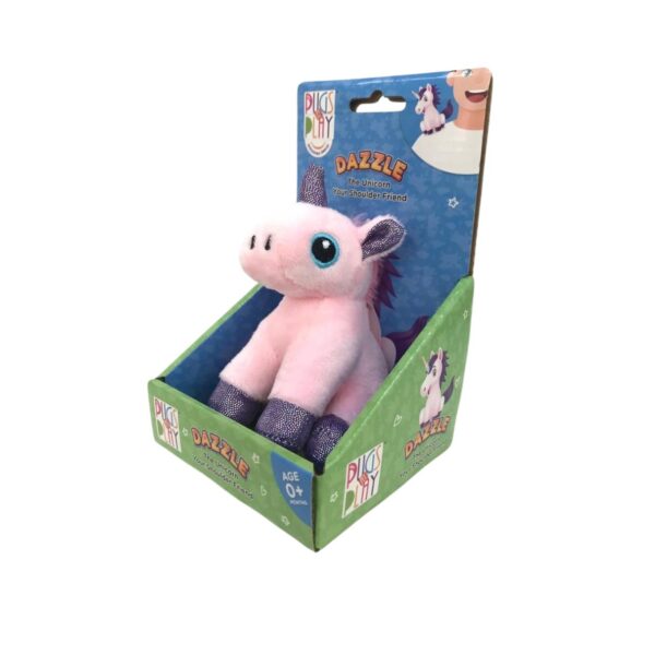 - Meet “Dazzle,” the adorable unicorn toy for all ages! Dazzle is a delightful companion designed to bring magic and whimsy wherever you go. With a secure magnet attachment, Dazzle stays on your shoulder for hands-free fun. It sparks imaginative play, encourages social interaction, and fosters emotional development in children. Adults can also enjoy Dazzle as a fashionable accessory, adding a playful touch to any outfit.