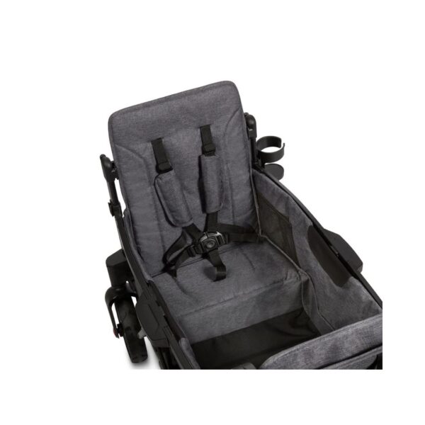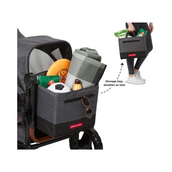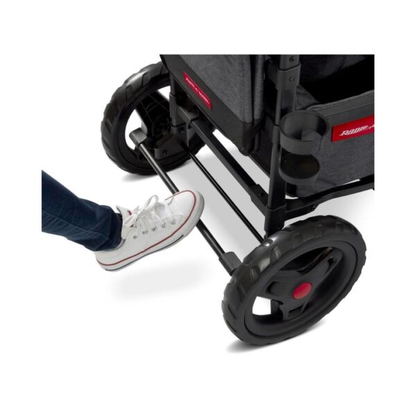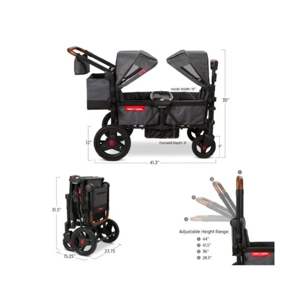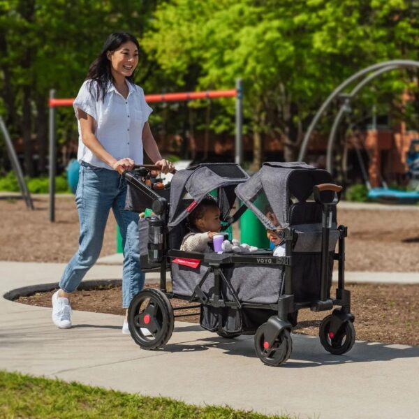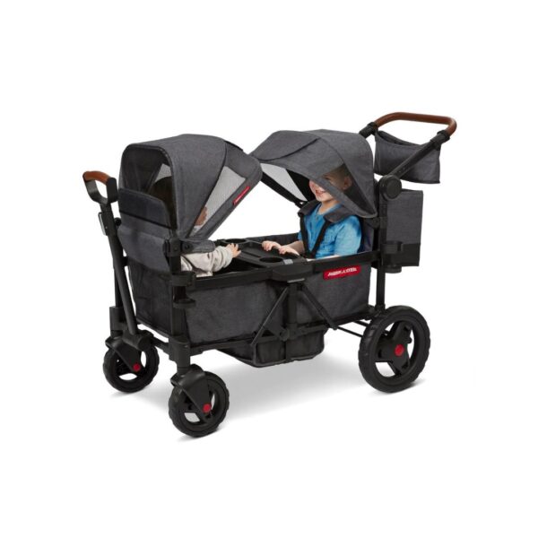 - Introducing the Radio Flyer Voya Stroller Wagon, a versatile solution for family outings. Comfortably carry two kids with built-in padded seats and spacious storage. Smart design folds compactly for easy travel, while push/pull capabilities ensure long-term usability. Safety is paramount with ASTM F833 compliance and features like harnesses, canopies, and a parking brake. Enjoy convenience and peace of mind on the go!