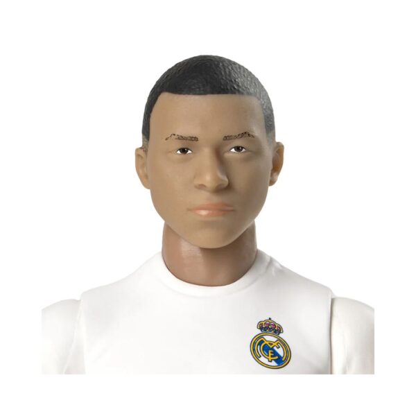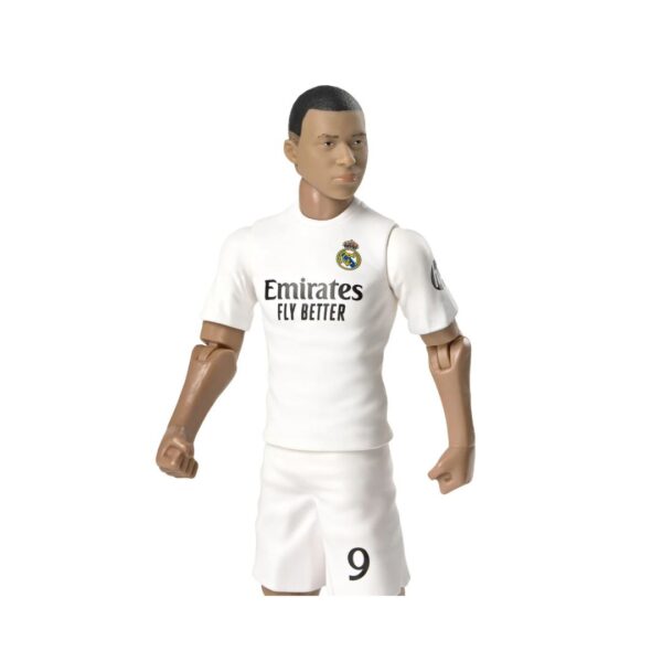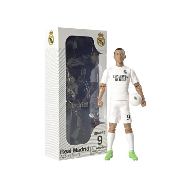 - The Real Madrid FC Mbappé 20cm Action Figure features Kylian Mbappé in his team kit with number 9, 10 points of articulation, and a Madrid football. It stands 20cm tall and comes in a display box, making it a great addition to any collection.