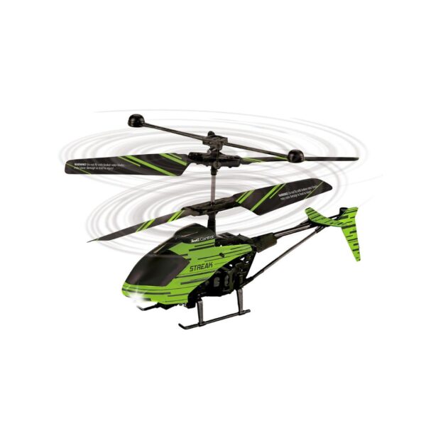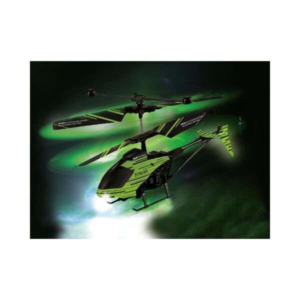 - Experience thrilling flying with Revell’s RC Helicopter “Streak” Glow In The Dark. It’s small, indoor, and glow-in-the-dark feature adds excitement. With a 2-channel IR control, it simplifies operation, allowing for focused flying. The gyro and rotor system ensure stability, perfect for beginners. Convenient wireless charging and a durable plastic build make it reliable. From beginners to experts, the “Streak” promises exciting flying adventures.