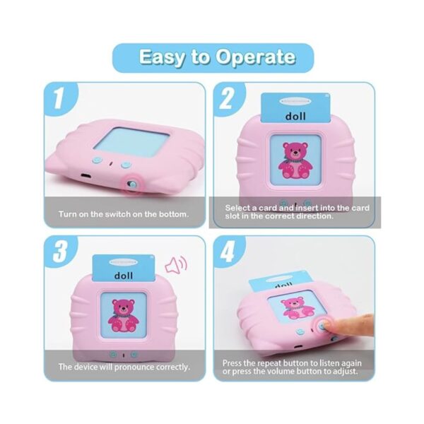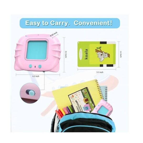 • Flash Card Reader Device: The package includes a handheld card reader device (color: pink) that reads and pronounces words from the flash cards.