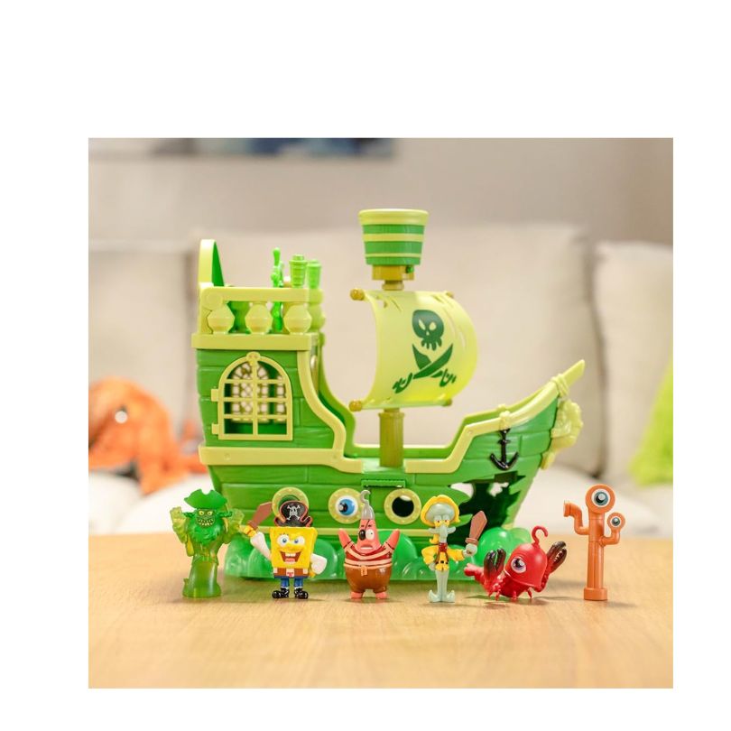 - Set sail for spooky deep-sea adventure with this exclusive SpongeBob Movie Ghost Ship Playset! Packed with action, mystery, and iconic characters, this set includes 6 exclusive movie figures — SpongeBob, Patrick, Squidward, a translucent glowing Flying Dutchman, and two deep-sea creature figures ready for battle beneath the waves. The ship is loaded with interactive surprises, including trap doors, a retractable plank, a firing cannon, hidden compartments, and a ghost-controlled steering wheel for dynamic storytelling. With hidden wheels for smooth rock-and-roll motion, kids can create eerie ocean scenes and high-stakes ghost ship showdowns just like in the movie. This is the ultimate playset for SpongeBob fans who love action, adventure, and imaginative play!