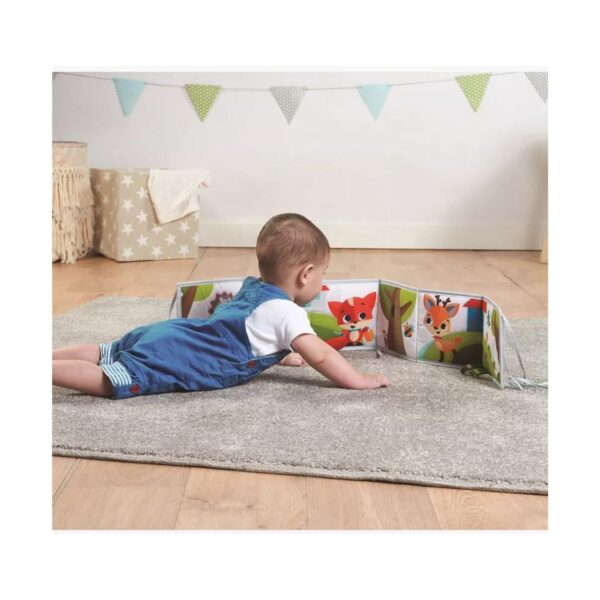 - This double-sided interactive baby book is a versatile and thoughtfully designed tool to engage and stimulate your baby at different developmental stages. One side features high-contrast black-and-white designs, perfect for younger babies, while the other side displays colorful, fun-filled designs to captivate older babies. The book includes seven engaging activities to encourage tummy time, helping strengthen your baby’s shoulder and neck muscles. With a mix of playful textures, contrasting shapes, and vibrant characters, this book offers a sensory-rich experience that supports visual, tactile, and motor development. Its foldable design ensures easy portability, making it a great companion for on-the-go fun and learning.
