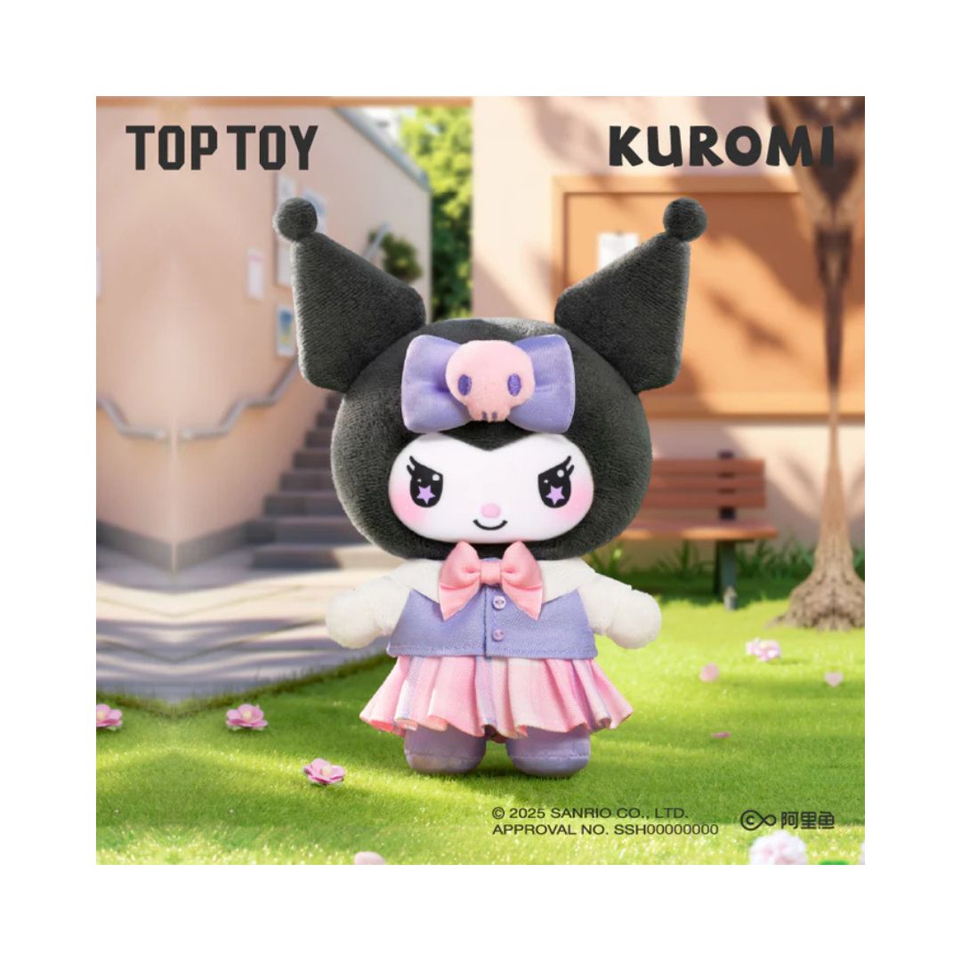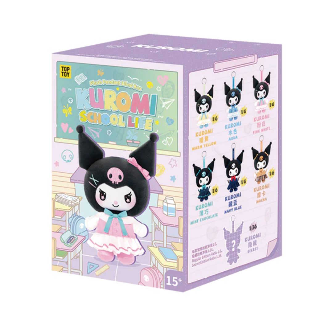 - The Kuromi School Life Series Plush Pendant Blind Box by Top Toy (officially licensed by Sanrio) showcases Kuromi dressed in six adorable school-themed outfits—ranging from sporty to studious. Each pendant comes with plush-style detailing, a keychain attachment, and a collectible surprise inside random packaging. Clip her to your bag, backpack, or display her on a shelf for instant kawaii personality wherever you go.