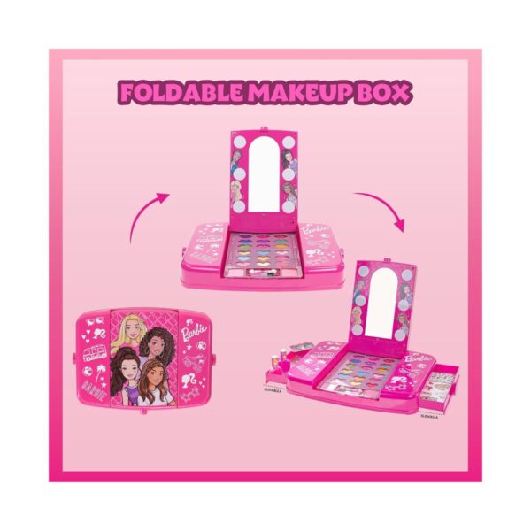 • The Complete Makeup Set is an all-in-one beauty kit designed to spark creativity and bring endless fun to little girls aged 3 and up. This Barbie-inspired cosmetic set is packed with vibrant colors, glittery finishes, and delightful accessories to let kids explore the world of beauty safely. The kit includes everything your little princess needs for a glamorous makeover, from glitter lip glosses and shimmer eye shadows to peelable glitter nail polishes and fun Barbie-themed stickers. Whether for playdates, sleepovers, or special occasions, this set encourages imagination, self-expression, and hours of entertainment.