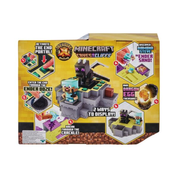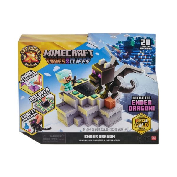 - Bring your Minecraft adventure to life with the Treasure X Minecraft Caves & Cliffs – Ender Dragon playset! Embark on a quest to find Diamond Steve, battle the Ender Dragon, and mine for REAL Gold Dipped Treasure. This playset offers 20 levels of adventure, including activating the End Portal, diving through Ender Ooze, and using a Pickaxe to discover hidden treasures.