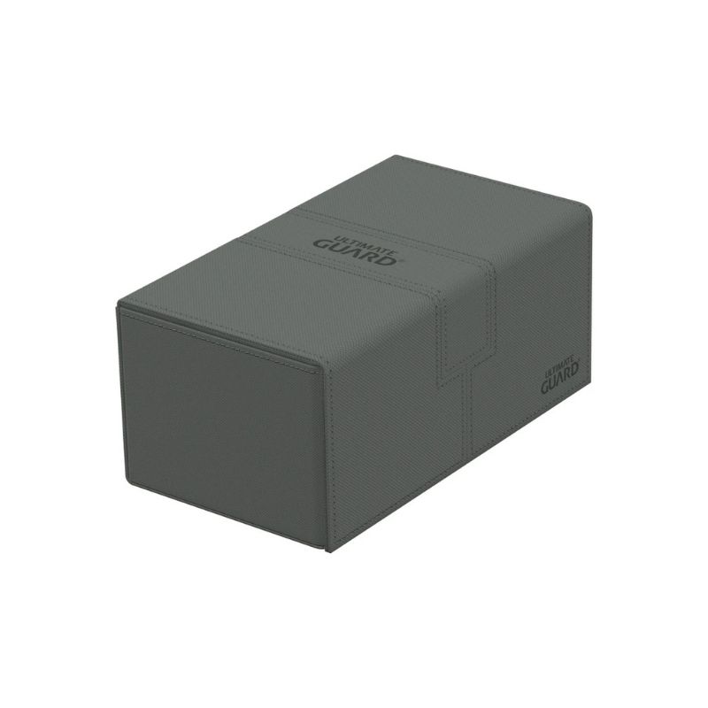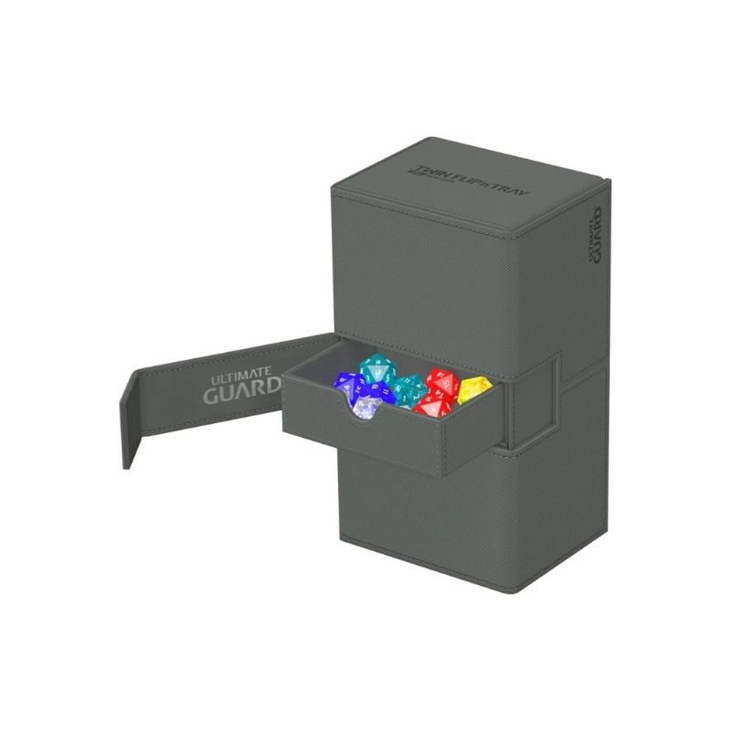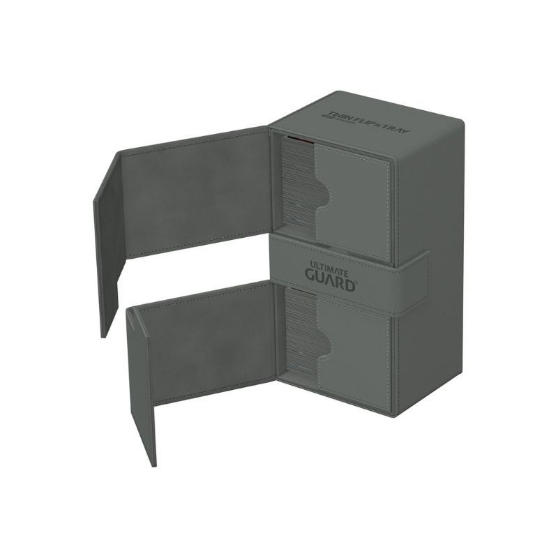 - The Ultimate Guard Twin Flip’n’Tray 200+ Xenoskin in Grey is a premium deck box designed for serious trading card collectors and players. Its sleek Xenoskin textured surface offers superior durability and a professional matte finish. Featuring two removable card trays and one accessory tray with magnetic lids, it provides easy access and organization for up to 200 double-sleeved or around 240 single-sleeved cards. This deck box combines practicality, protection, and style.