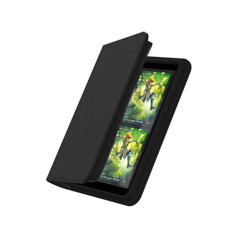 - The Ultimate Guard Zipfolio 160 8-Pocket Xenoskin Binder is a premium storage solution designed for collectors of trading card games. Featuring a sleek black XenoSkin™ exterior, this binder offers a durable and stylish way to organize your collection. It includes 20 integrated 8-pocket pages, each capable of holding 8 cards, accommodating up to 160 double-sleeved cards. The side-loading pockets and secure zipper closure ensure your cards remain safe and easily accessible.