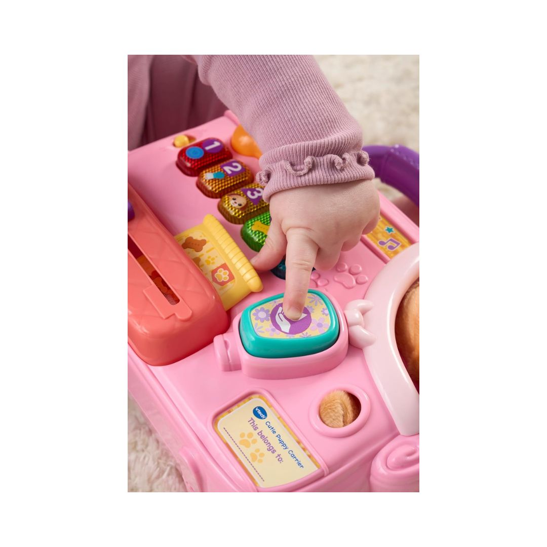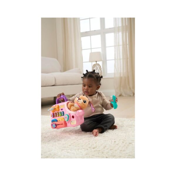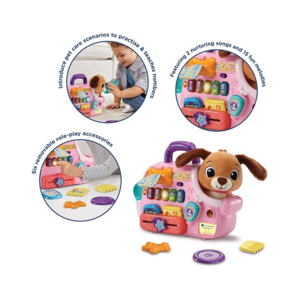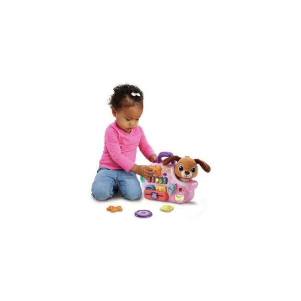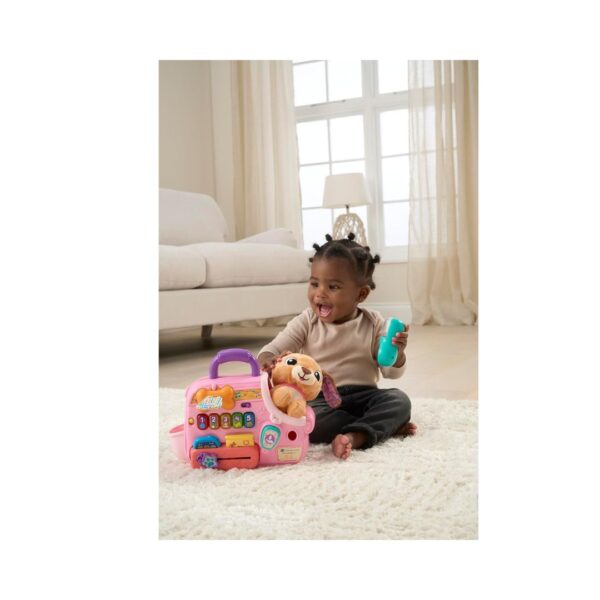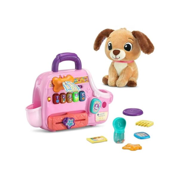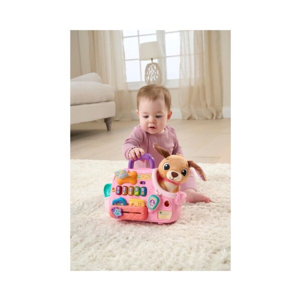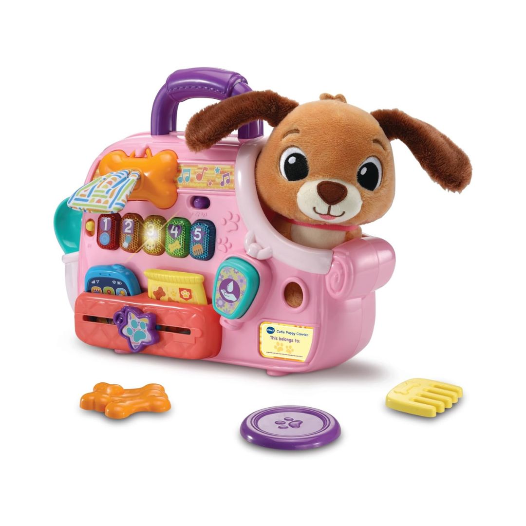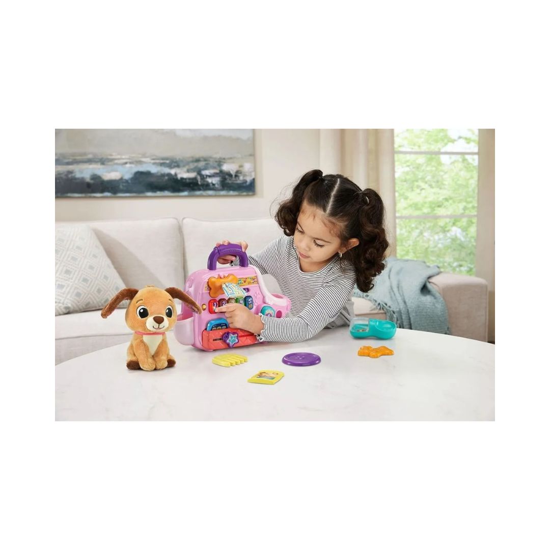 - Embark on fun adventures with this interactive puppy carrier. Comes with a soft plush puppy and 6 removable accessories water bottle rattle, comb, treats, bone, flying disk, and mobile for pretend play. Includes fidget features like a moving zip, crinkly pouch, and squeaky hand sanitizer. Light-up buttons teach numbers, colours, shapes, and pet care. Plays 2 songs and 15 melodies for engaging play. Perfect for imaginative, educational, and interactive fun.