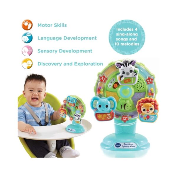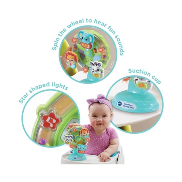• Colorful VTech baby spinning wheel toy with musical buttons and animal images, designed for interactive play and learning