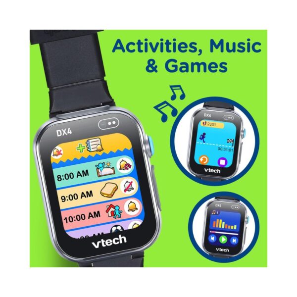 - The VTech KidiZoom DX4 Smartwatch – Black is the ultimate wearable for kids, combining fun, creativity, and active play in one stylish device. With dual cameras, a splash-proof design, built-in games, and a premium metal body, this smartwatch lets kids capture memories, stay active, and explore their imagination. It also helps children practice telling time with over 50 digital and analog clock faces, while offering exciting apps and interactive features. Perfect for kids aged 4 and up, it’s a smart companion for fun and learning.
