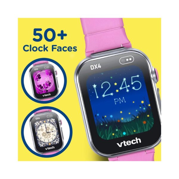 - The VTech KidiZoom DX4 Smartwatch in pink is a fun, durable, and educational smartwatch made for kids aged 4–12. It comes with a 1.69″ full-color touchscreen, dual cameras for selfies and videos, and 50+ animated watch faces to make learning to tell time exciting. Kids can play built-in games, AR challenges, and step-tracking activities, while also using creative tools like a music player, sound effects, and photo filters.