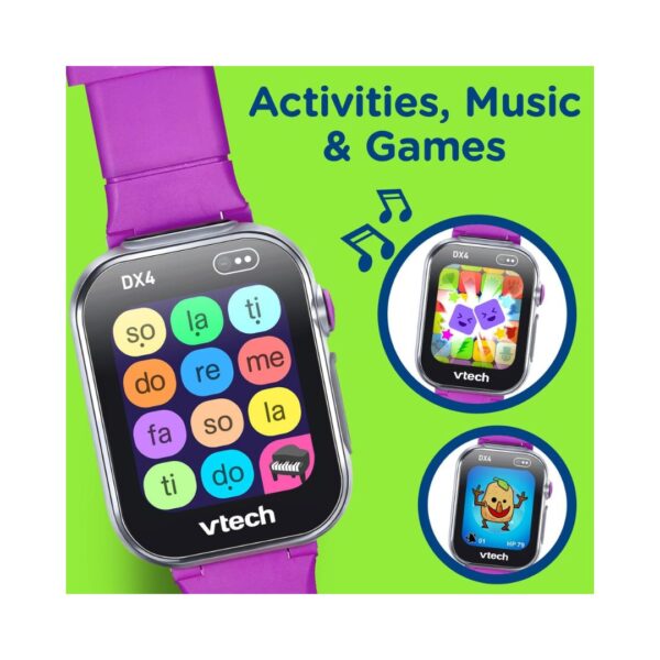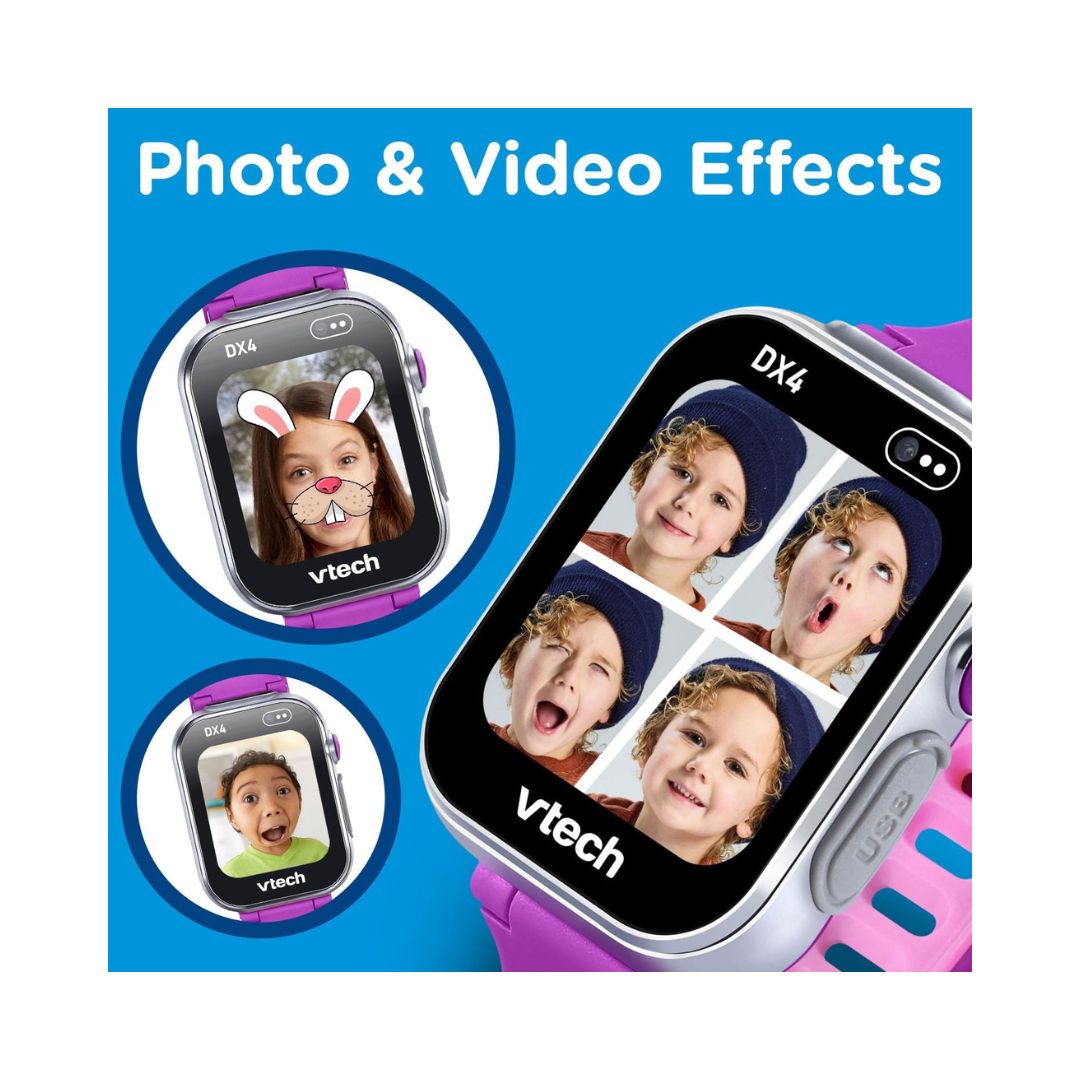 - The VTech KidiZoom Smartwatch DX4 Purple is the ultimate wearable for kids, combining fun, creativity, and learning in one stylish device. Designed with a premium metal body, dual cameras, and a splash-proof build, this smartwatch keeps children entertained with games, activities, and creative tools. From capturing photos and videos to exploring music with the Composer app, the DX4 encourages imaginative play while helping kids practice telling time with interactive clock faces. Safe, durable, and rechargeable, it’s perfect for children ages 4 and up.