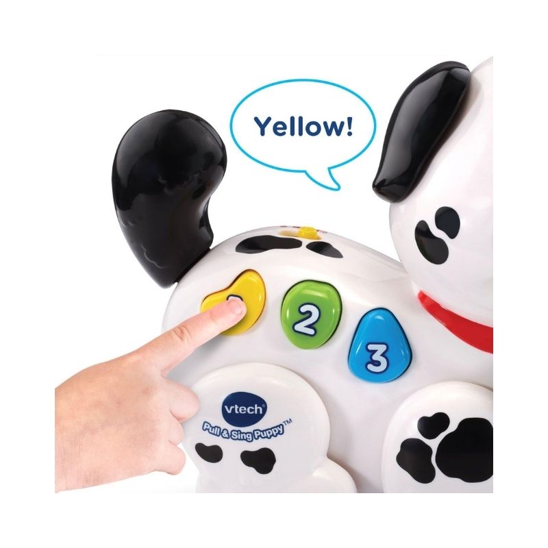 • A colorful Vtech Pull Along Puppy Pal toy with wheels, designed for toddlers to encourage walking and imaginative play