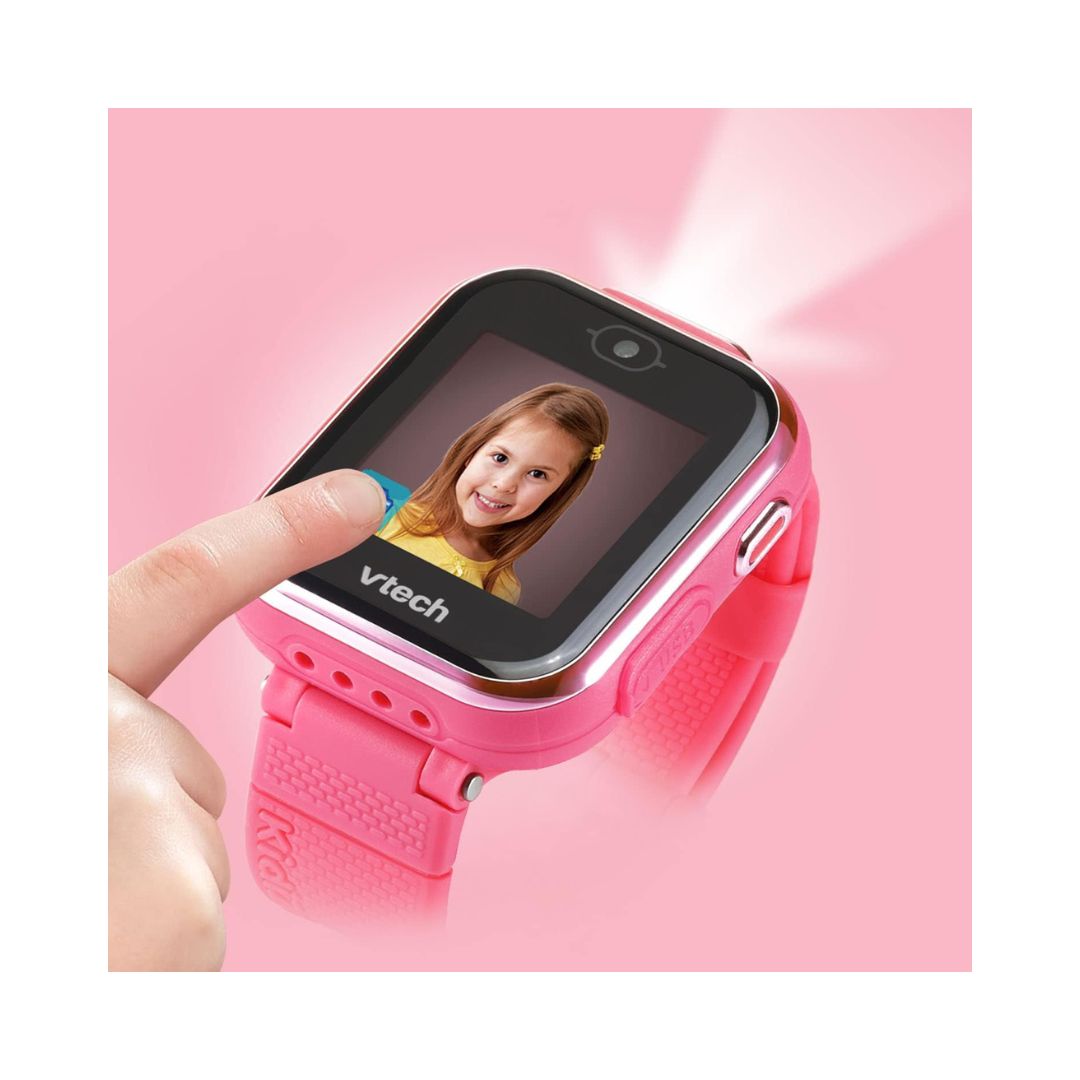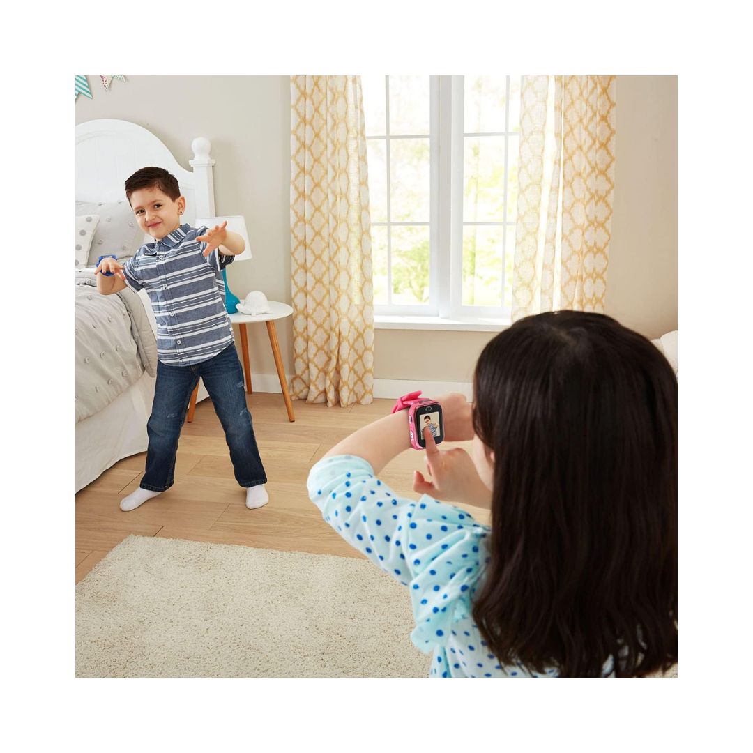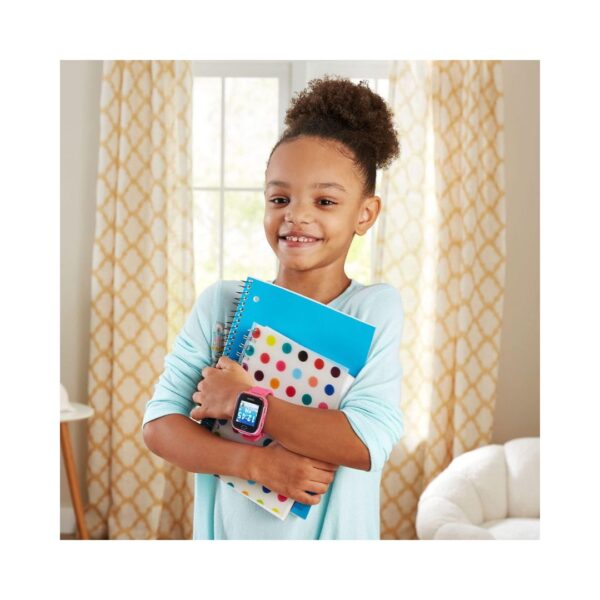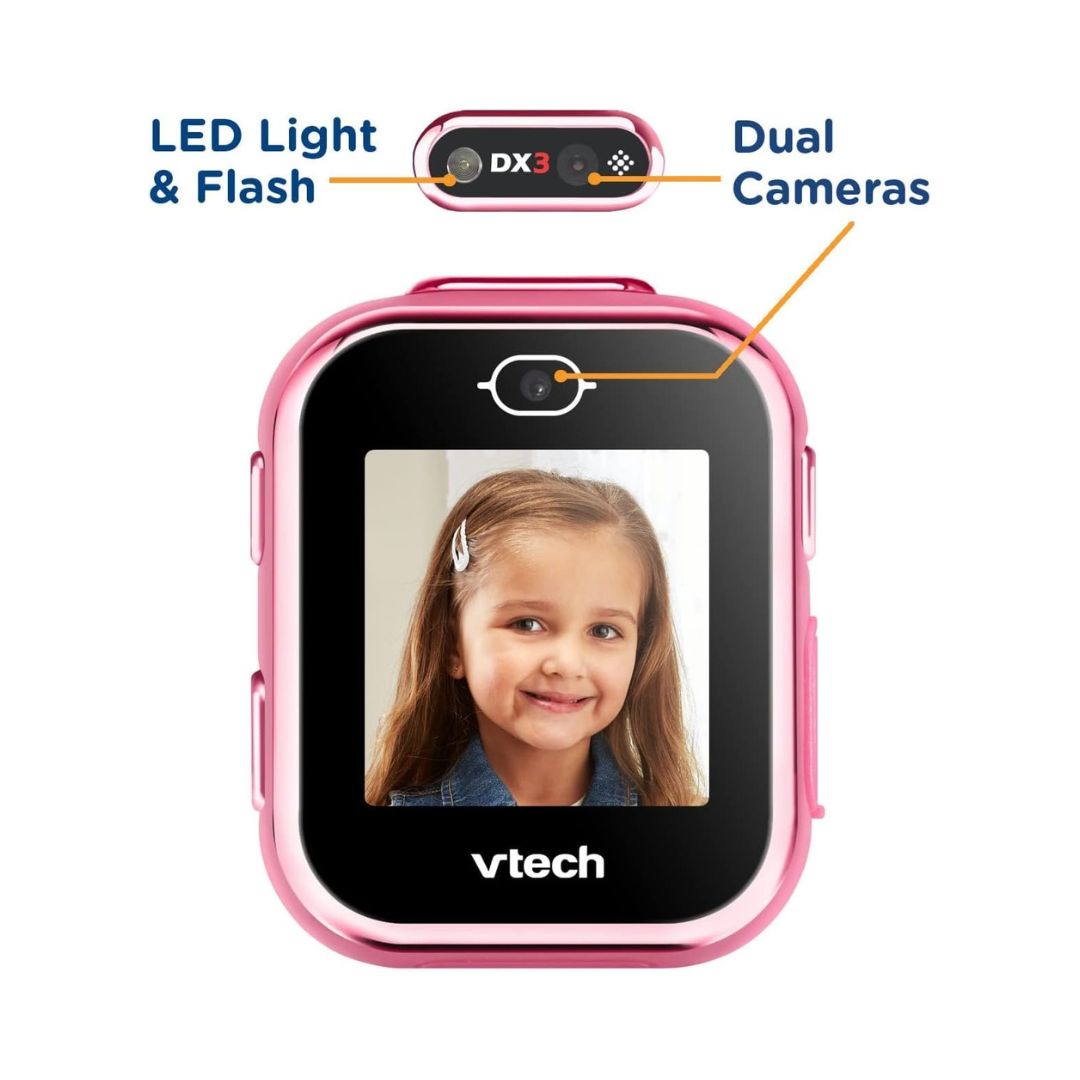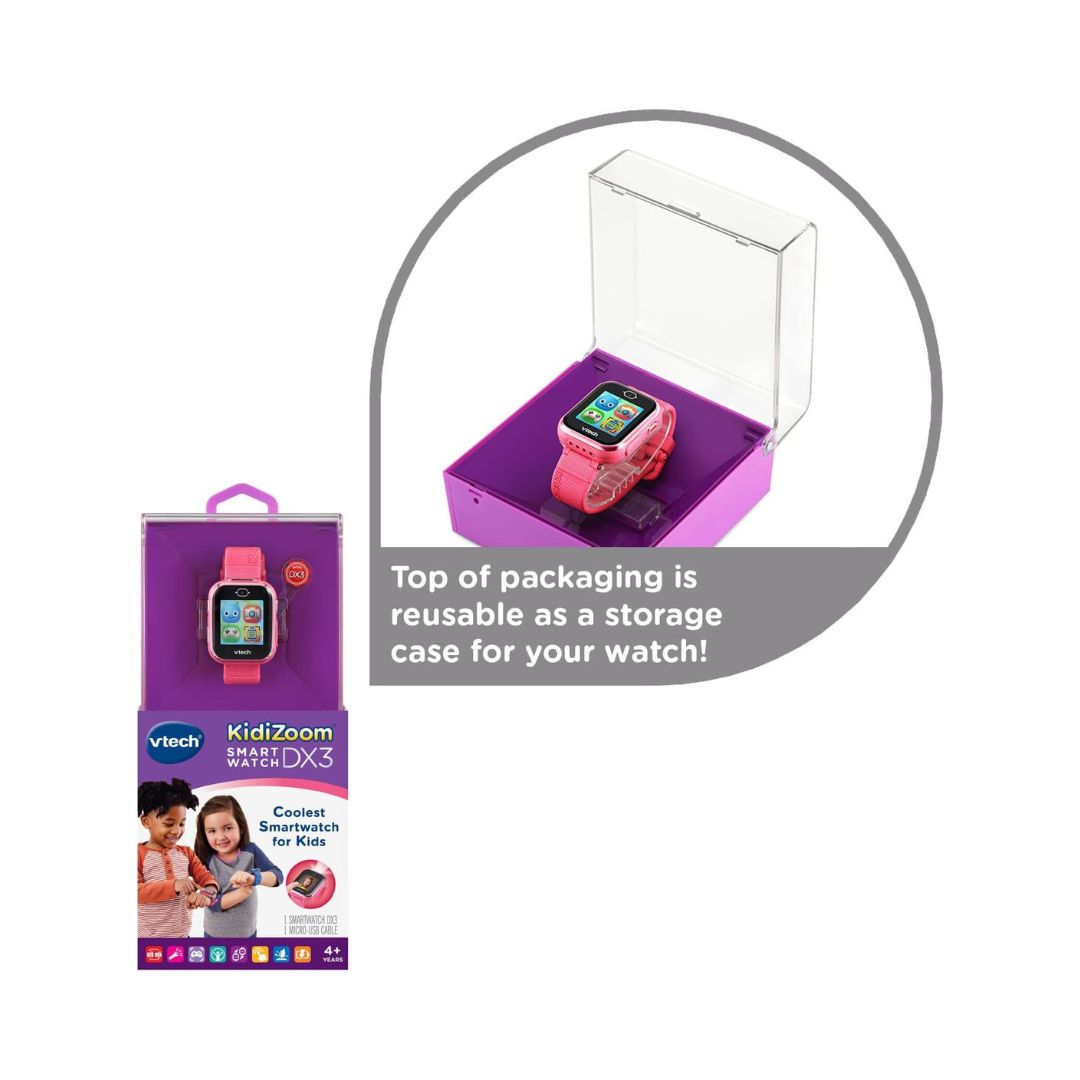 • Accessorize any outfit with the VTech KidiZoom DX3 Smartwatch a fun, kid-friendly pink watch packed with dual cameras, a multifunctional watch light that works as a flashlight and camera flash, and over 50 animated clock faces. Customize clock faces using photos and videos, and switch to school mode for watch-only use during class. Kids can play three movement games solo or pair with another DX3 to enjoy multiplayer games. The package includes a rechargeable smartwatch and a micro-USB charging cable, plus a clever upcyclable package that converts into a storage case.