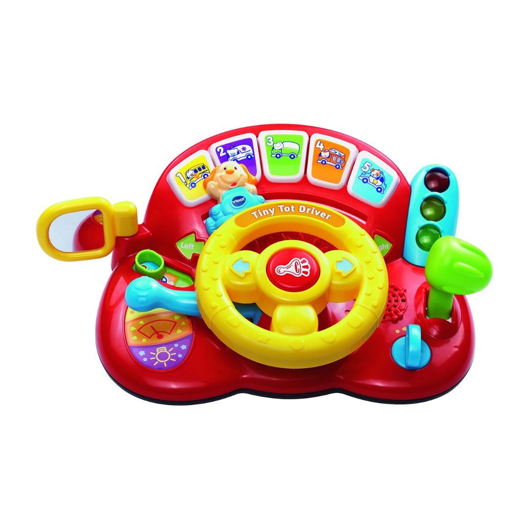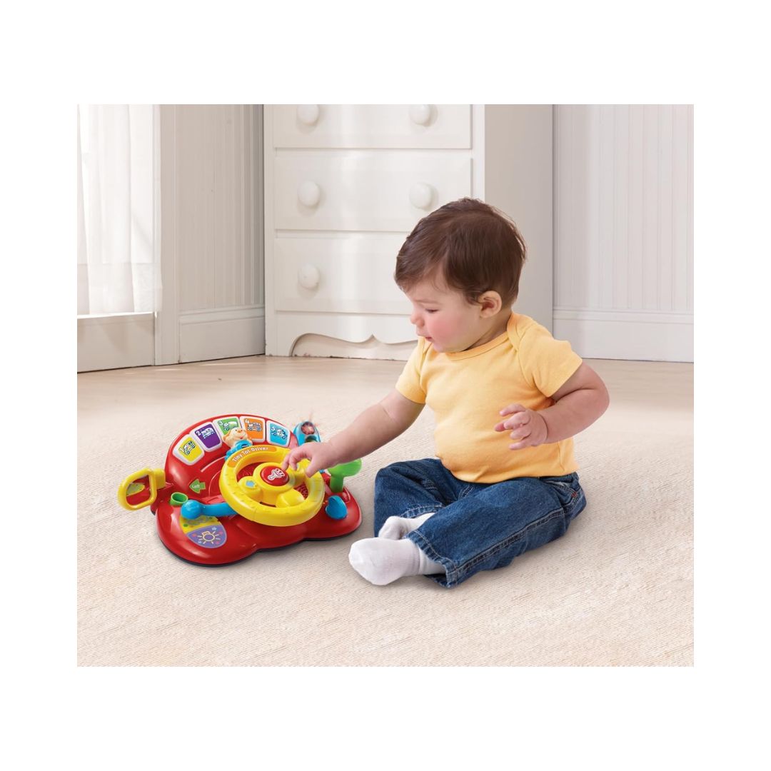 - Turn playtime into an exciting learning adventure with this interactive driving toy! Packed with engaging buttons like a horn, traffic lights, an ignition key, and a turning wheel, this toy helps your child explore the world of vehicles while building key motor and cognitive skills. A non-breakable mirror promotes self-discovery, while cheerful melodies and sing-along songs keep little ones entertained and engaged.