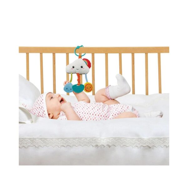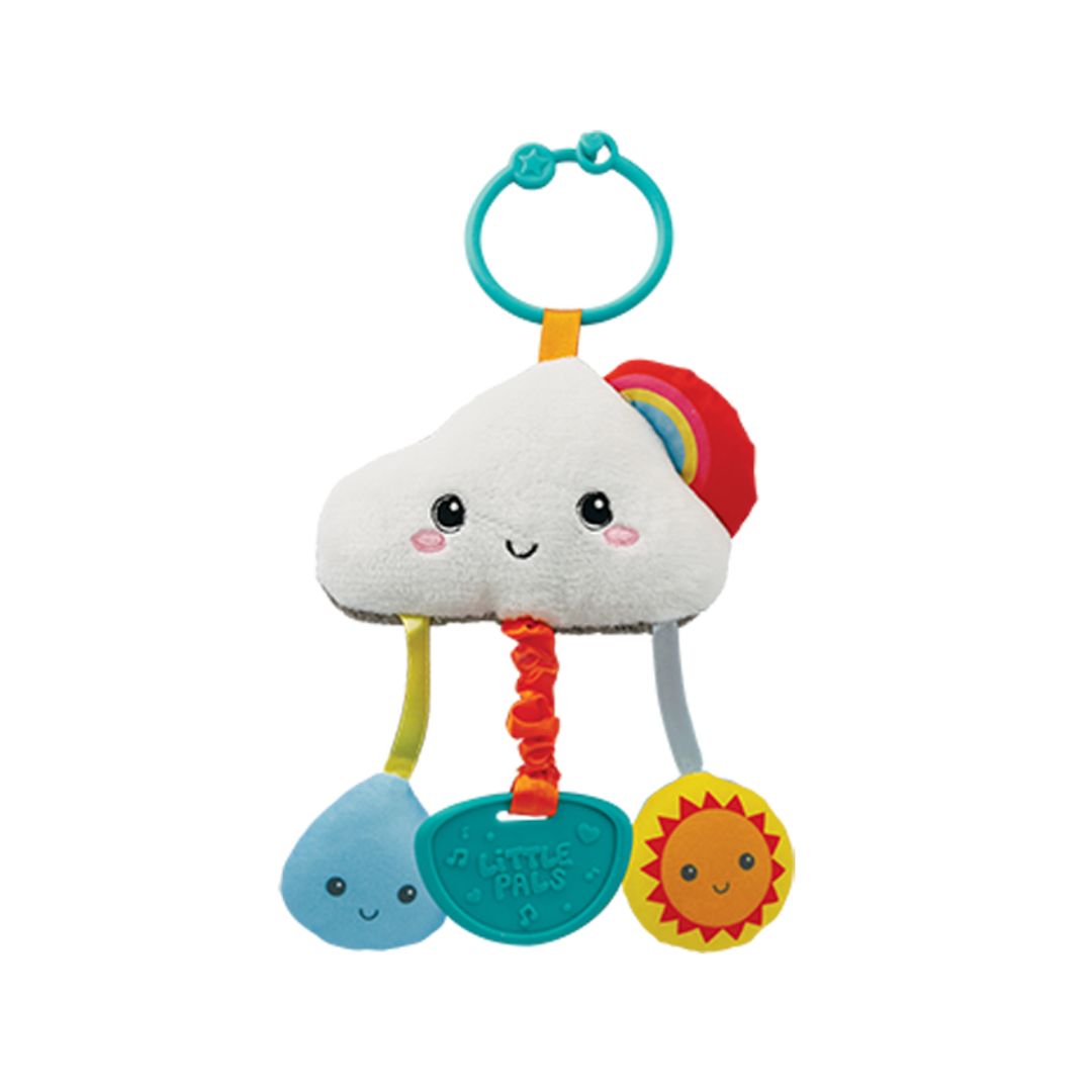 - Keep your little one entertained at home or on the go with the Take-Along Cloud Activity Toy. This soft and playful cloud comes packed with fun activities featuring a squeaker, retractile teether with vibration, and a chime bell rattle for endless sensory play. The convenient plastic ring easily attaches to strollers, car seats, or play gyms, making it the perfect travel companion for babies.