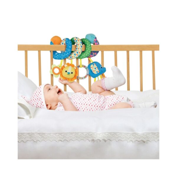 - The Spiral Toy with Animal Friends is a fun and engaging companion for babies, designed to keep little ones entertained at home or on the go. Its spiral design easily wraps around crib rails, strollers, or car seat handles, bringing playful activities within reach. With a baby-safe peekaboo mirror, satin taggies, and a rattle ring, this soft and colorful toy encourages sensory exploration, fine motor skills, and endless giggles.