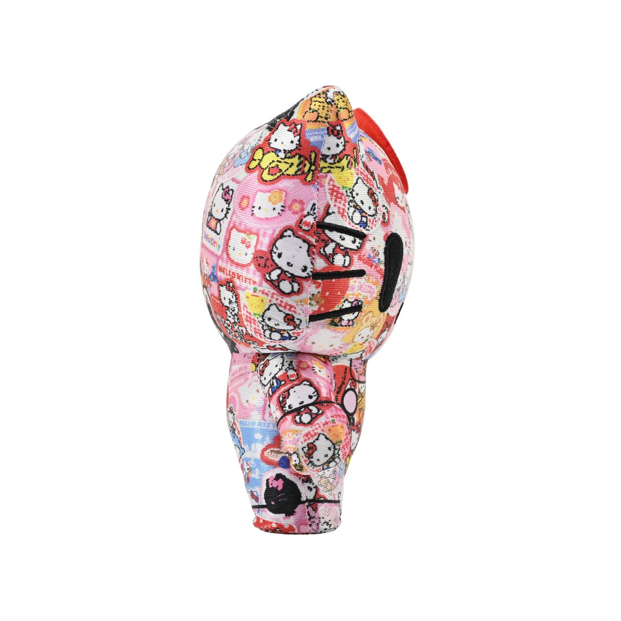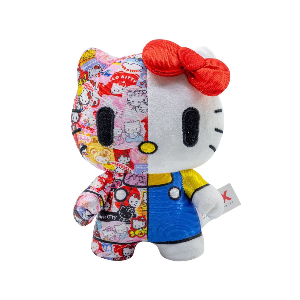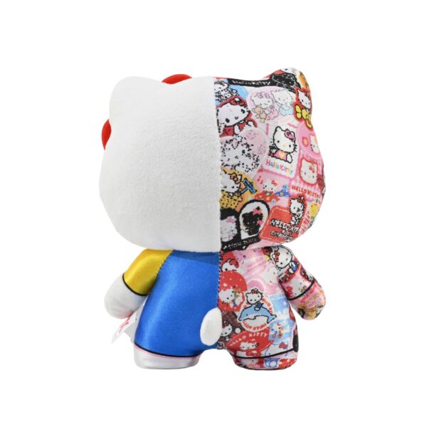 - Unique Split Design: This plush showcases a distinctive split design, with one half depicting Hello Kitty’s classic appearance and the other half featuring a stylized graphic montage, celebrating both tradition and modern artistry.