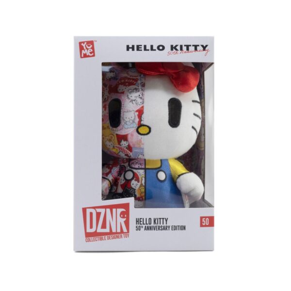 - The Sanrio DZNR Plush Figure Hello Kitty 50th Anniversary Edition (18 cm) is a special collectible created to commemorate Hello Kitty’s 50th anniversary. Produced by YuMe Toys, this officially licensed plush stands approximately 18 cm tall and features a unique design that celebrates Hello Kitty’s legacy.