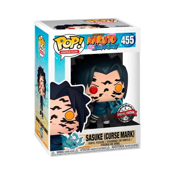 • The Funko Pop! Animation: Naruto – Sasuke w/ Curse Marks (Exc) figure is likely a special edition release featuring Sasuke Uchiha with Curse Marks. In the Naruto series, the Curse Marks are significant indicators of increased power and the character’s connection to Orochimaru’s influence.